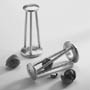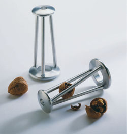 Drei Edelstahlstangen sind in zwei handschmeichelnden, linsenförmigen Aluminiumscheiben frei beweglich gelagert. Wenn man nun die beiden Scheiben gegeneinander verdreht, verringert sich der Abstand zwischen den Stangen und die eingelegte Nuss wird geknackt. Ein wahrliches Gadget, das durch sein außergewöhnliches Design und Funktion besticht.