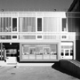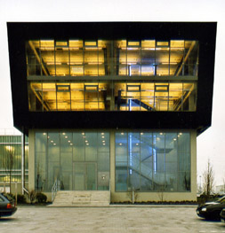 Drei Hauptelemente gliedern die Anlage entsprechend Ihren Funktionen: Das Hochregallager im Norden ist über das Kommissioniergebäude mit dem Büro- und Ausstellungsgebäude im Süden verbunden. Die drei Gebäudeteile umschließen einen tiefergelegenen Hof, der als Anlieferbereich dient. Die hier angeordnete orangefarbene Lagerbürobox stellt die zentrale Anlaufstelle für den Lieferverkehr dar. Eine leuchtende Treppenskulptur erschließt das über dem Haupteingang schwebende Büro- und Ausstellungsgebäude. |