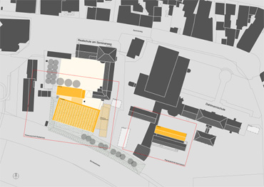 Die vorhandenen Gebäude der Realschule am Seminarweg und des Dahlmann-Gymnasiums sollten um jeweils einen Anbau und eine gemeinsame Sporthalle erweitert werden. Die Planung der Neubauten erforderte einerseits eine sensible Einordnung in die vorhandene homogene Struktur, andererseits wirkt sie ordnend auf das gesamte Ensemble. |