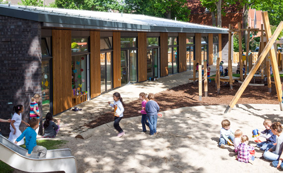 Das von der Kirche dominierte Grundstück der Friedenskirchengemeinde wird um eine moderne Kindertagesstätte ergänzt. Mit ihrer dynamischen Form vermittelt sie zwischen der Kirche, dem Gemeindehaus und Pastorat, dem sie angegliedert wird und der umliegenden Wohnbebauung. Zwei Dachscheiben verschieben sich derart gegeneinander, dass Licht in die mittig im Gebäude gelegene großzügige Halle fällt. Die Halle teilt den langgestreckten Bau in einen westlichen Gebäudeteil, der die Büros und Nebenräume aufnimmt und die nach Osten zum Außenspielgelände ausgerichteten Gruppenräume. Die Halle selbst dient der Erschließung und als Bewegungsraum. Ein Geländesprung wird in der Halle mittels einer Rampe sowie einer breiten Treppe mit Rutsche überbrückt und thematisiert. Die dynamische Gebäudeform setzt sich im Inneren mit einem verspielten Stützenwald und in den Decken eingelassenen Lichtblitzen fort.Die Fassade aus dunklem Verblendmauerwerk mit reliefartig hervortretenden Steinen öffnet sich nach Osten durch großzügige, bodentiefe Verglasung. Farbige Paneele zwischen den Öffnungen betonen die einzelnen Gruppenräume. Jeder Gruppenraum besteht aus einem mittigen Basisraummodul, das sich um zwei weitere, seitlich angrenzende unterschiedlich große Raummodule ergänzen lässt. Alle drei Raumbereiche haben einen direkten Zugang zum Außenbereich. Dieses flexible Raumsystem erfüllt je nach Nutzungsanforderung die entsprechenden (förderfähigen) Raumprofile: Jedes Modul kann eine Krippe mit großem Schlafraum und kleinerem Gruppenraum, eine Familiengruppe mit kleinem Schlafraum und mittelgroßem Gruppenraum oder eine Elementargruppe mit einem großen Gruppenraum bilden. So lässt sich das Gebäude an veränderte Anforderungen im Laufe der Nutzung anpassen. Den Gruppen vorgelagert befinden sich die Garderoben, die an die großzügige Halle angrenzen. Öffnungen zwischen dem Gemeindehaus und dem Bewegungsraum lassen eine gemeinsame Nutzung zu.