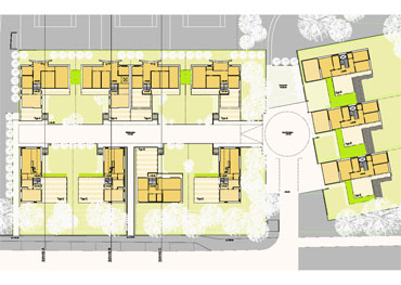 Auf das erhöhte Lärmaufkommen durch den angrenzenden Tennisplatz reagiert der Entwurf mit einer Südausrichtung der an den Tennisplatz grenzenden Häuser. Zusätzlich geschlossen werden die Nordfassaden durch elegant geschwungene Wandscheiben, die die Eingänge und die Fenster vor Schall und Einblicken schützen. Weder der Tennisplatz noch die Wohnanlage beeinträchtigen einander.