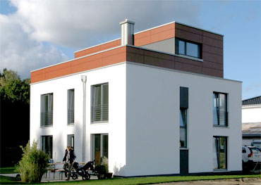 Auf geringem Raum wurde der hohe Platzbedarf für eine Familie mit drei Kindern realisiert. Ein weisser Kubus, gekrönt von einem dynamischen, roten Staffelgeschoss ist das neue Zuhause der Familie. Der weisse Kubus nimmt die Gemeinschaftsräume der Familie sowie die Zimmer der Kinder auf. Im Staffelgeschoss befindet sich das Zimmer der Eltern. Durch Form und Farbe setzt es sich von den unteren Geschossen ab. Seine roten Fassadenplatten bilden gleichzeitig das Geländer für die großzügige Dachterrasse. |