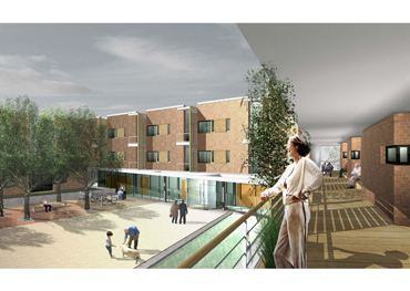 Alle Bereiche des Hauptbaukörpers sind mit einem Laubengang verbunden. Aufweitungen bieten Abstellmöglichkeiten für Gehwagen und Rollstühle. Sitzgelegenheiten und bepflanzte Bereiche machen die Laubengänge zu Bewegungs- und Kommunikationsräumen.